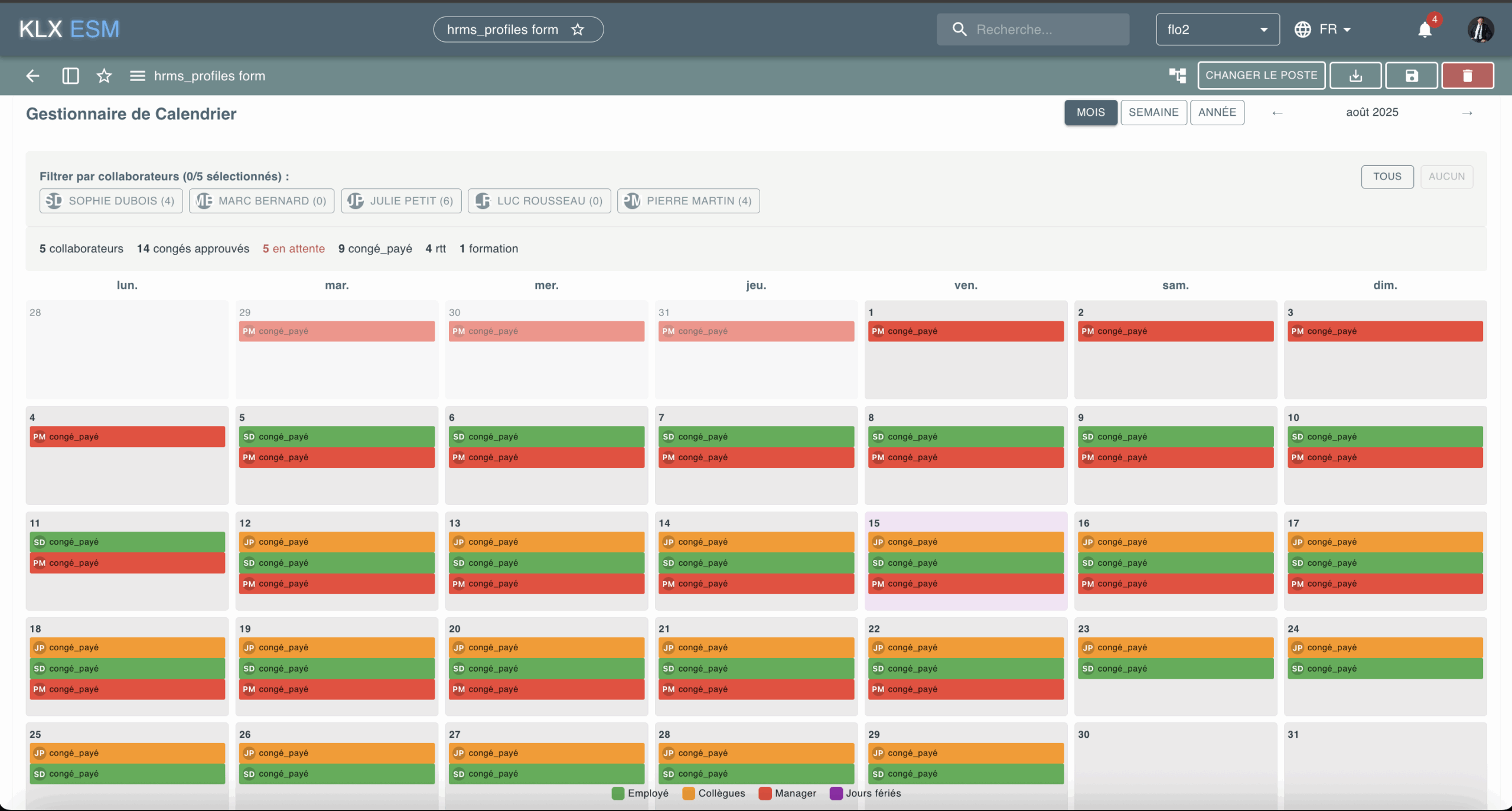 Le gestionnaire de calendrier KLX HRMS offre une vision complète et partagée des congés, absences, formations et jours fériés de vos équipes.