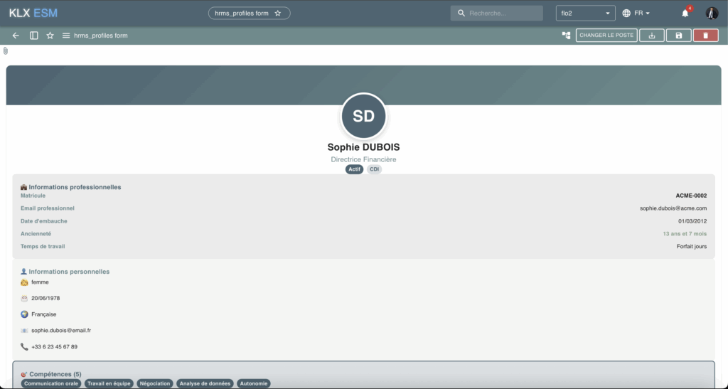 Chaque salarié dispose d’un profil unifié, regroupant toutes ses informations clés : données professionnelles, personnelles, historiques et compétences.