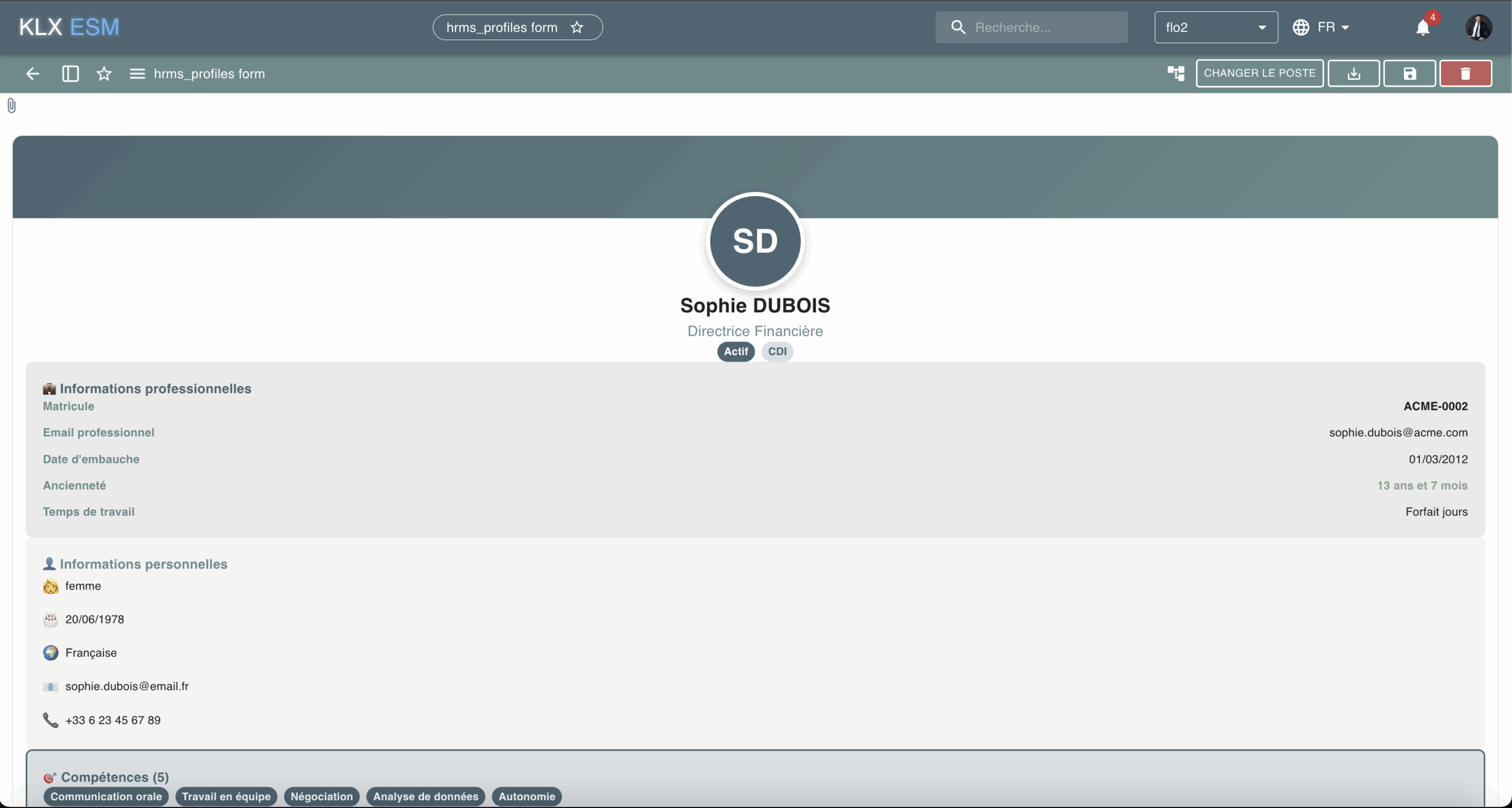 En un coup d’œil, les RH accèdent à l’ensemble du parcours du collaborateur : poste, contrat, ancienneté, coordonnées, et compétences.