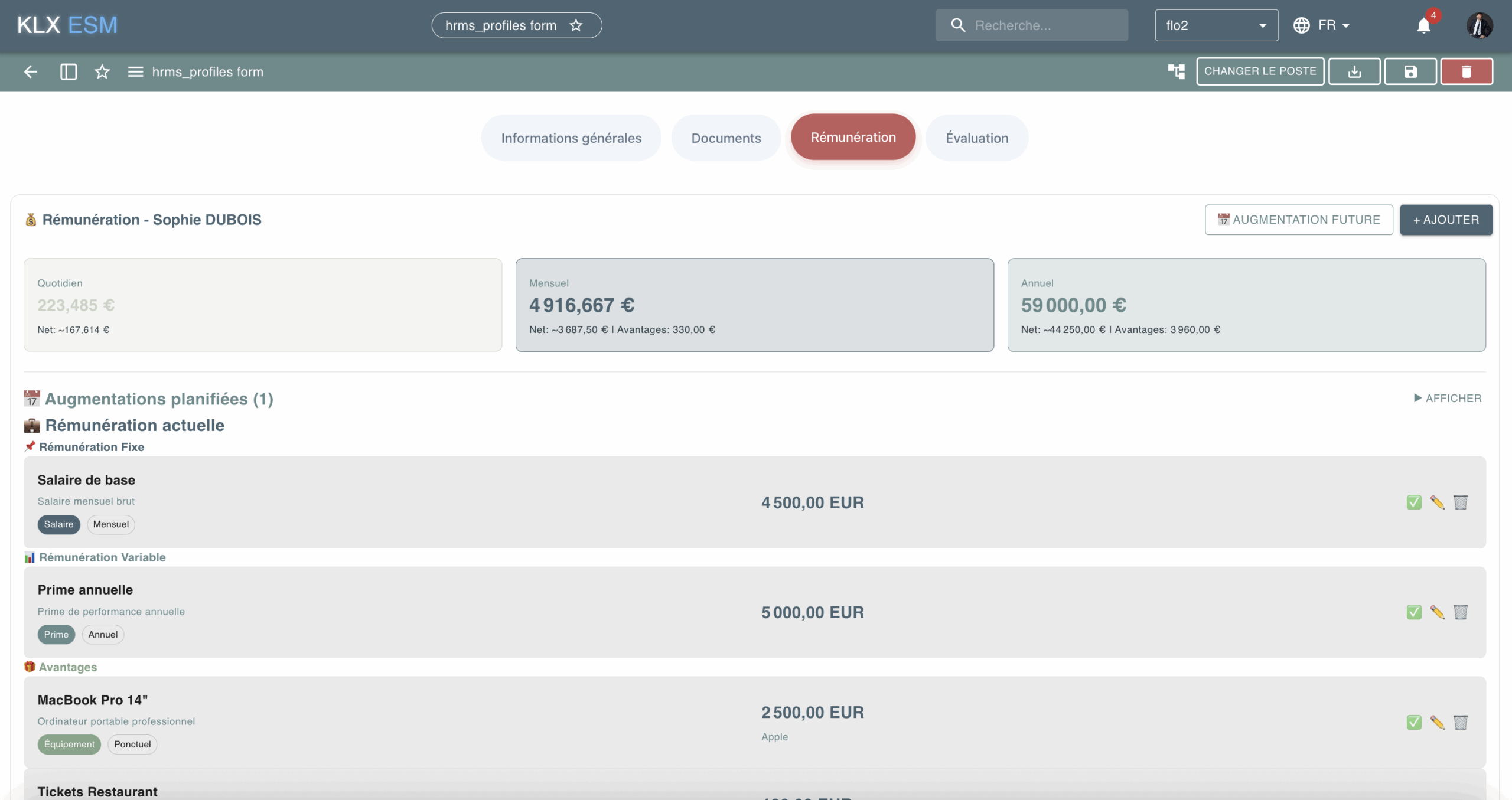 Chaque élément est structuré, daté et historisé, pour offrir une lecture claire et cohérente du package global de chaque collaborateur.