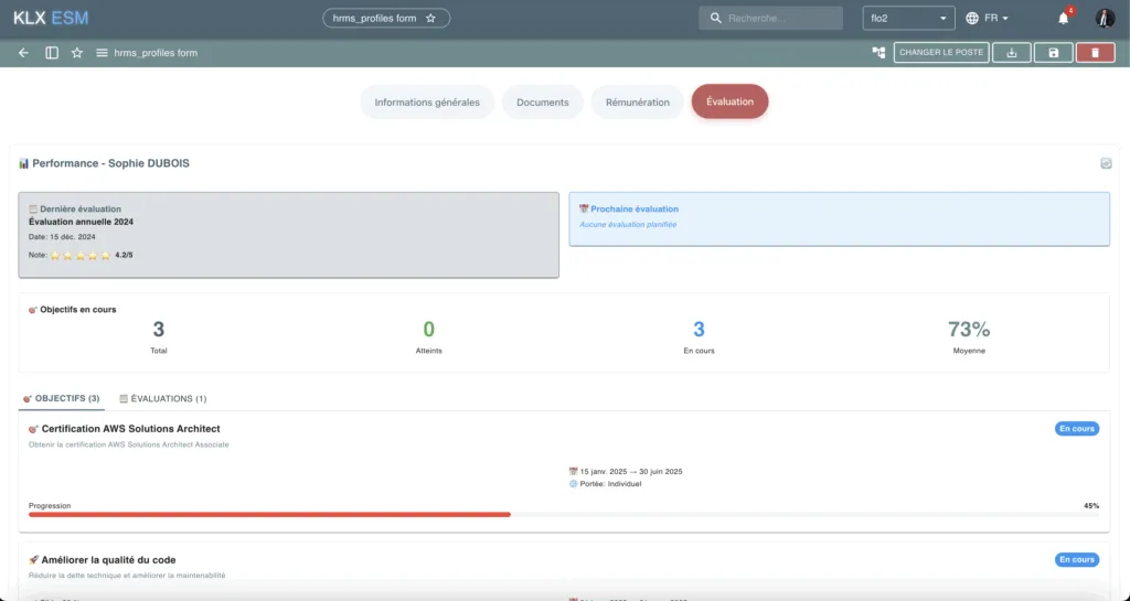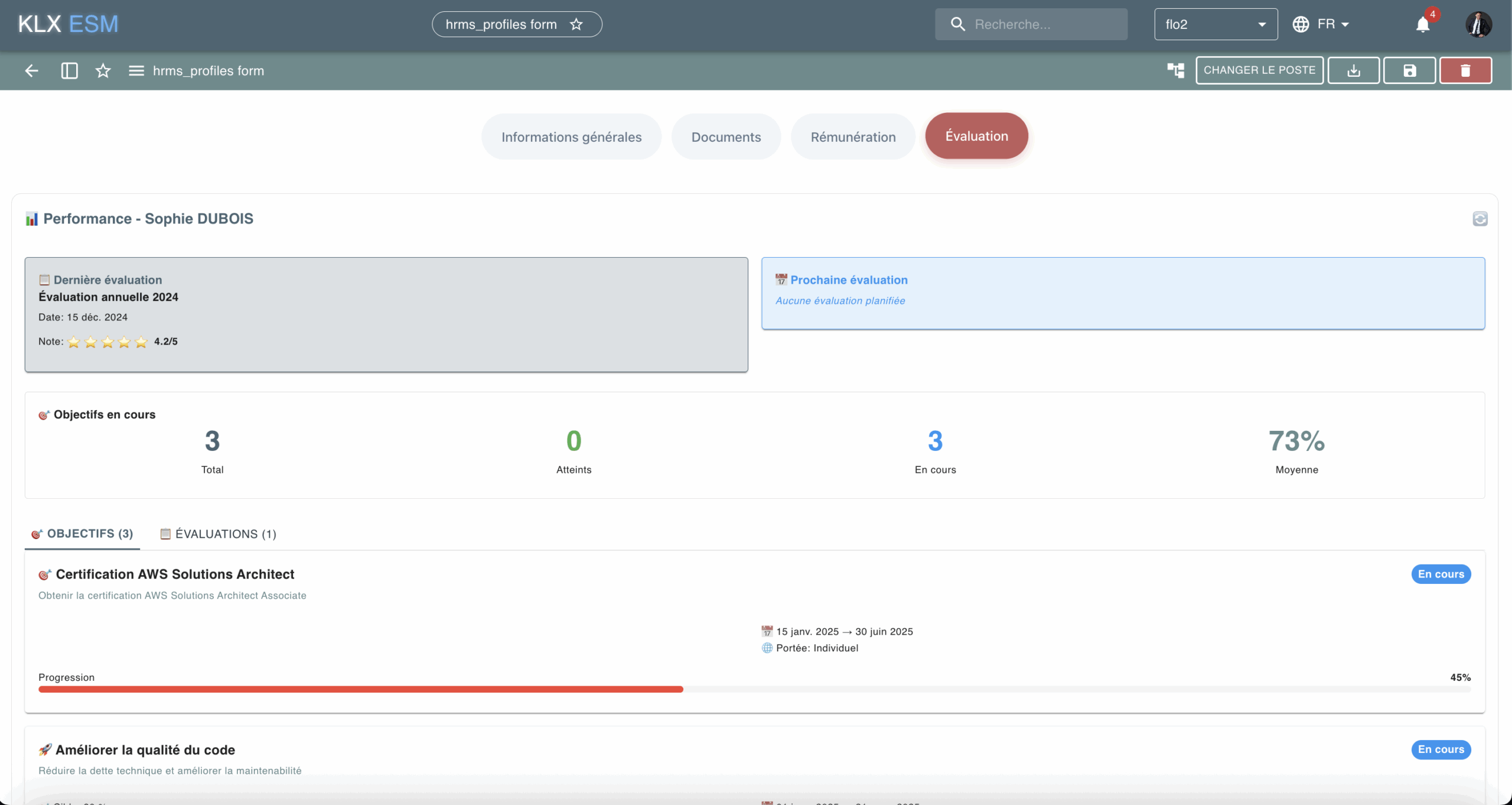 KLX HRMS simplifie le suivi des évaluations annuelles et des objectifs de performance.