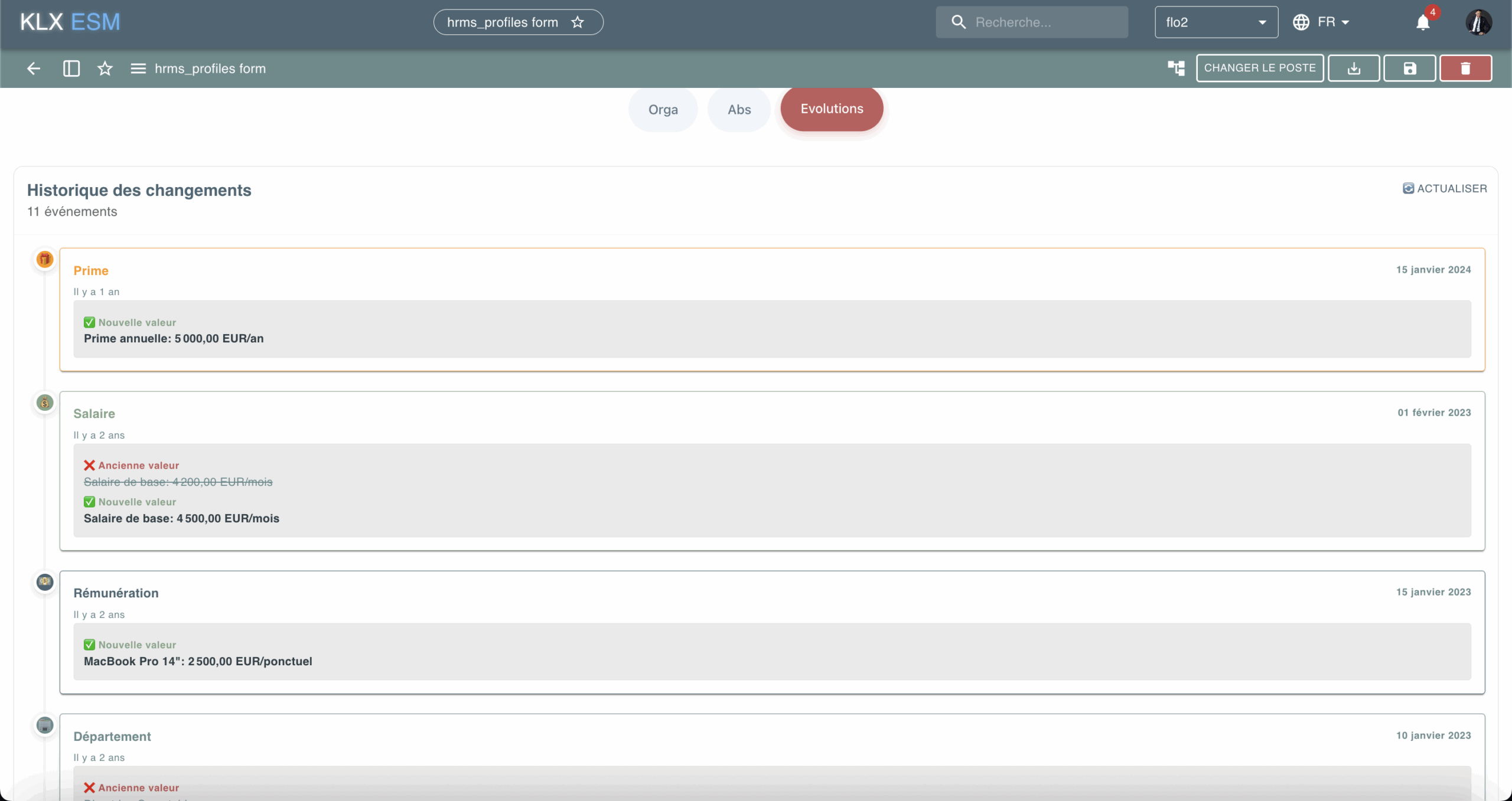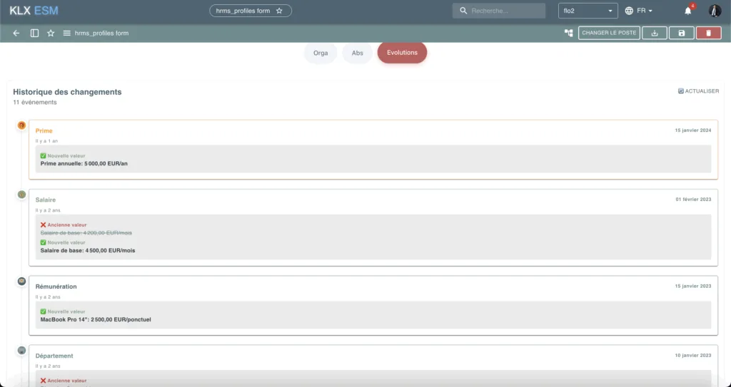 KLX HRMS trace automatiquement chaque évolution : changement de poste, augmentation, prime, mobilité ou modification contractuelle.