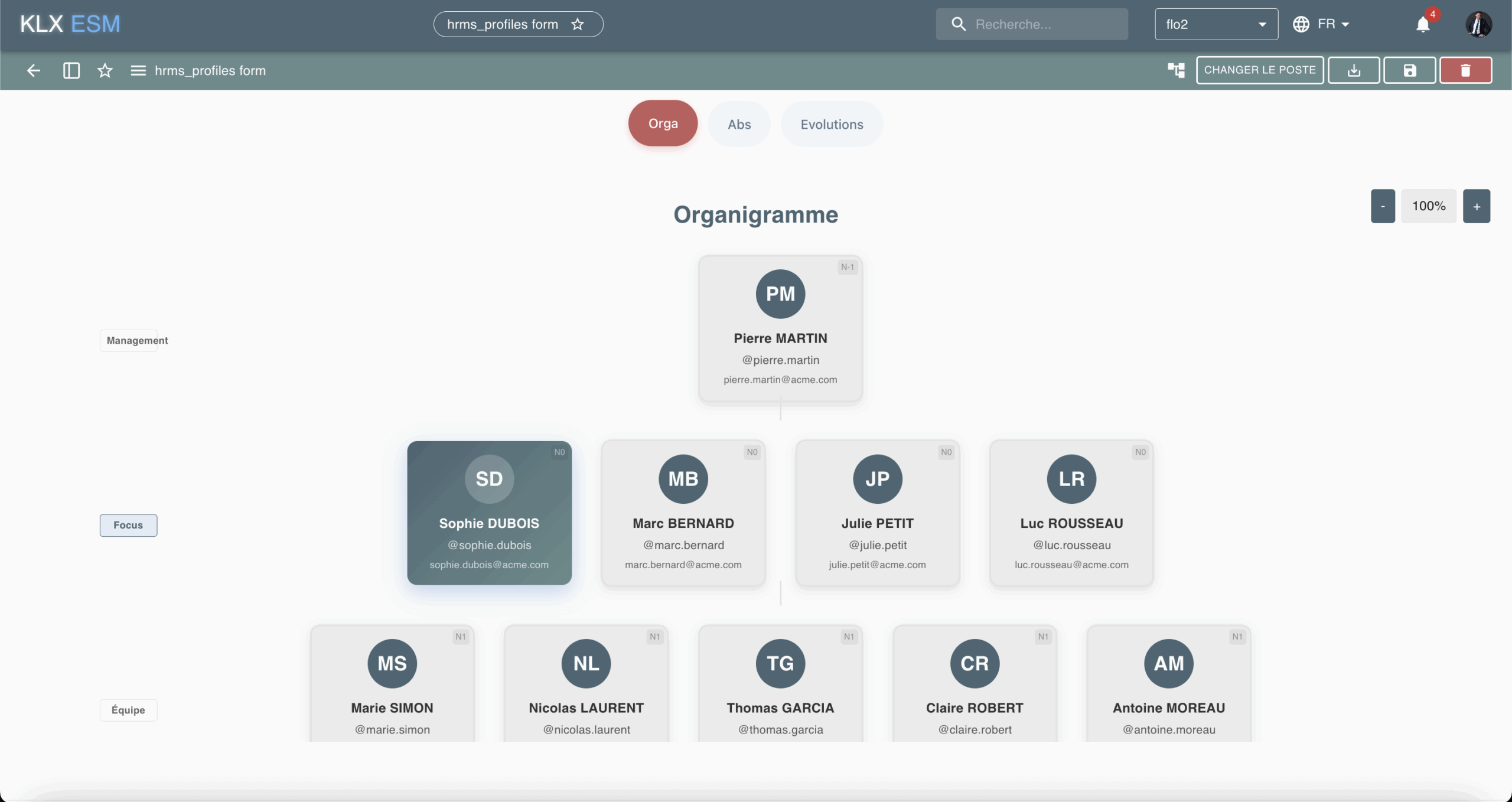 L’organigramme KLX HRMS offre une représentation visuelle et dynamique de votre structure hiérarchique.